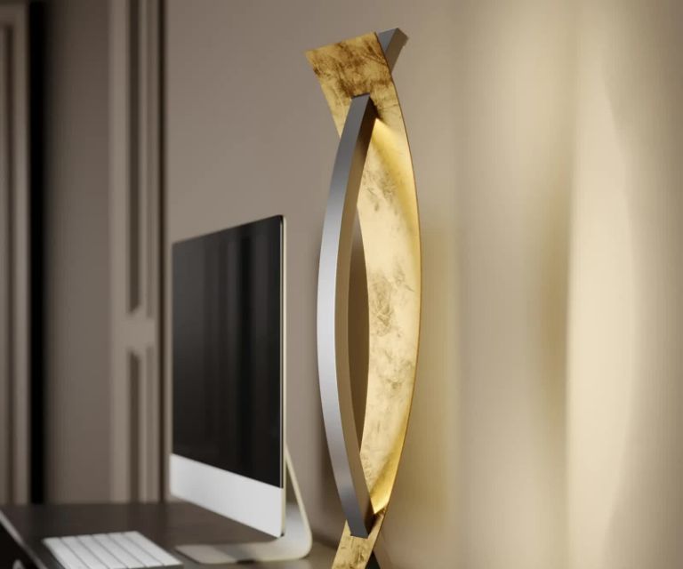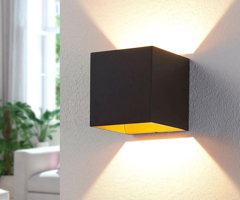 Led-seinävalaisin Aldrina, valmistaja Arcchio: tarkasti kohdennettu valo saadaan aikaan pistemäisellä valonlähteellä (led). Kullanvärinen varjostimen sisäpinta luo tunnelmallista valoa, 6 watin kulutuksella 440 luumenin verran.