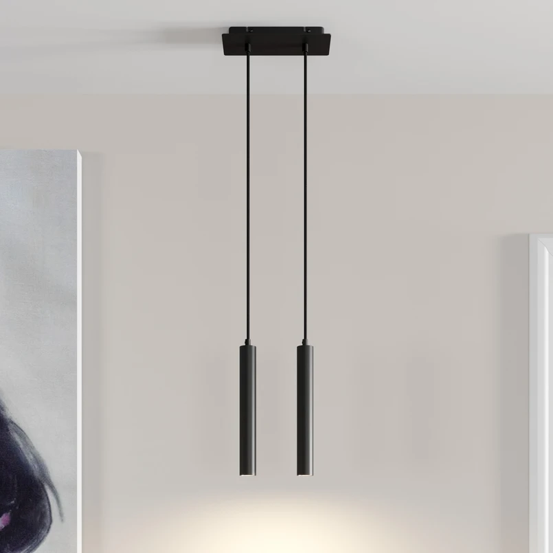 Kaksivaloinen Franka LED-riippuvalaisin, jossa on mustat alumiinisylinterit varjostimina - ihanteellinen tiskipöydille ja ruokapöytiin Tämä riippuvalaisin on kaunis katseenvangitsija, joka soveltuu erityisen hyvin pöydän tai tiskin valaistukseen. Kaksi varjostinta ovat erittäin ohuita, pyöreitä ja alumiinista valmistettuja. Musta pintakäsittely viimeistelee kokonaisuuden esteettisesti ja hienostuneesti ja säteilee viileää eleganssia. Kaiken kaikkiaan Franka sopii hyvin moderniin sisustukseen, ja lämpimän valkoisen valon värinsä ansiosta valaisin sopii erinomaisesti olohuoneeseen ja eri huoneiden viihtyisään valaistukseen. Kaksi varjostinta säteilevät melko pistemäistä valoa, jonka sädekulma on 24 astetta. LED-tekniikan ansiosta virrankulutus ja kirkkaus yhdistyvät hyvään hyötysuhteeseen. Korkea IK08-iskunkestävyysluokitus tekee Franka-riippuvalaisimesta kestävän valaisimen, josta voit nauttia pitkään - SDCM < 5