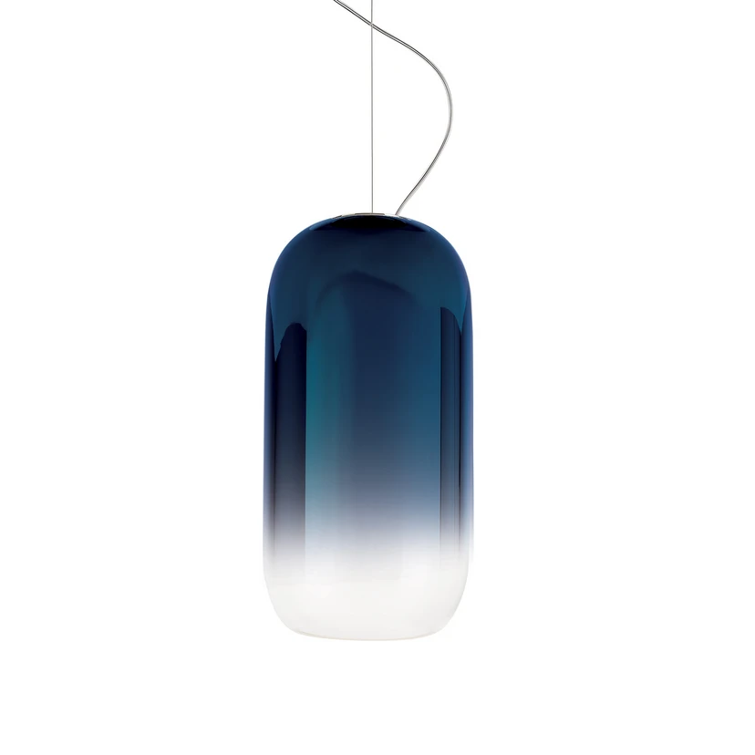 Gople-riippuvalaisimen lasivarjostin on valmistettu käsityönä vanhalla venetsialaisella tekniikalla. Puhallusprosessin aikana valkoinen lasi muuttuu vähitellen kristallilasiksi, joten jokainen lamppu on ainutlaatuinen. Värillinen pintakäsittely tehdään innovatiivisella metallin tyhjiöpinnoitusprosessilla. Lasin viimeistely suunniteltiin siten, että toisaalta valonlähde - käytetty valonlähde - on suojattu ja toisaalta valon suora säteily maksimoidaan läpinäkyvyyden avulla.
