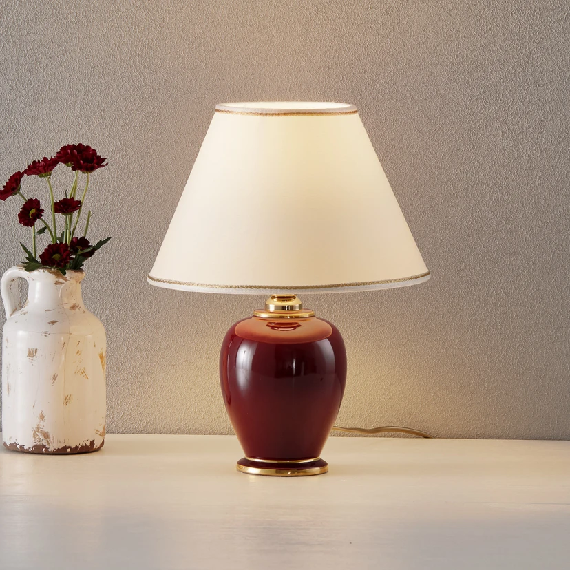 Klassinen, keraaminen Bordeaux-pöytävalaisin korkealaatuisella puuvillavarjostimella