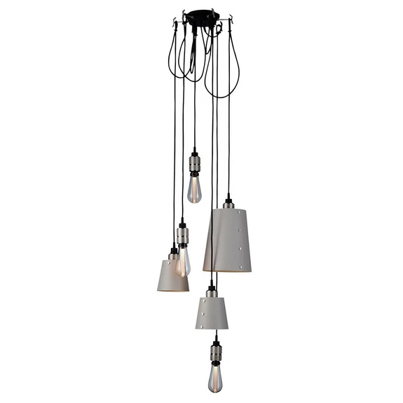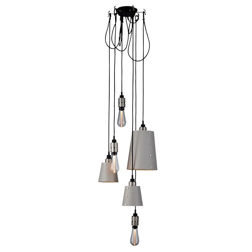 Kuusivaloinen Hooked 6.0 mix -riippuvalaisin, jossa on vaihtelevasti muotoillut ja säädettävät ripustukset Buster + Punchin kuusivaloinen Hooked 6.0 mix -riippuvalaisin on mielenkiintoinen, epätavallinen ja erittäin joustava. Kuusi pistorasiaa roikkuu kukin katoksesta 200 cm:n pituisilla vaijereilla. Yhtä kuudesta pistorasiasta ympäröi suuri metallinen varjostin, ja kahta ympäröi pieni metallinen varjostin, jossa on avoimet ruuvit. Loput kolme lampunpidintä roikkuvat avoimina, joten niiden timanttihiontainen ristikkäiskuvio on erityisen tehokas. Yhdistettynä koristeellisiin valonlähteisiin - valmistaja tarjoaa erityisesti tähän tarkoitukseen kehitettyjä valaisimia (ks. lisävarusteet) - valaisimen ulkonäkö täydentyy. Jokainen Hooked 6.0 mix -riippuvalaisimen kuudesta ripustimesta voidaan kiinnittää joustavasti toimitukseen sisältyvien koukkujen avulla. Ne voidaan ruuvata suoraan katokseen ympäriinsä, mutta ne voidaan myös kiinnittää eri asentoon suoraan kattoon (M5-kierre), joten erilaisia järjestelyjä voidaan toteuttaa halutun muotoilun tai valaistustehtävän mukaan. Vaikuttava Hooked 6.0 mix -riippuvalaisin on lontoolaisen Buster + Punch -yrityksen tuote. Vuonna 2013 perustettu tuotemerkki valmistaa valaisimien lisäksi myös toiminnallisia kalusteita ja sisusteita, pääasiassa massiivimetalleista, jotka tekevät vaikutuksen ainutlaatuisella luonteellaan.