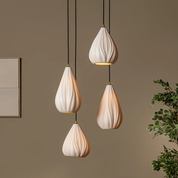 Cinzia yhdistää ilmavat riippuvalaisimet ja tukevat metallikaapelit ainutlaatuiseksi kokonaisuudeksi. Posliiniset riippuvalaisimet on koristeltu aaltomaisella kuviolla, joka luo pehmeän valotehosteen. Cinzia sopii hyvin keskusvalaisimeksi eteiseen, mutta myös tyylikkääksi valaisimeksi olohuoneen viihtyisään istuinalueeseen tai ruokapöydän yläpuolelle.