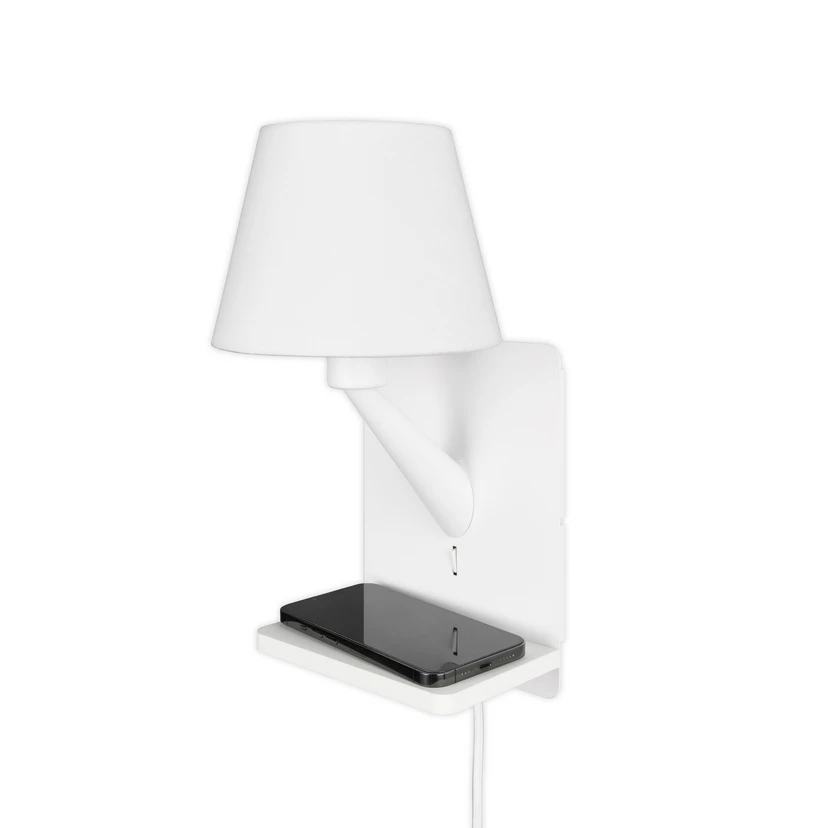 Comfort-seinävalaisin, jossa on varjostin ja monia toimintoja Metallista valmistettu yksivärinen Comfort-seinävalaisin, jossa on tekstiilivarjostin, todistaa nimensä monilla toiminnoillaan. Se on varustettu kytkimellä suoraa käyttöä varten, se voidaan kytkeä sekä pistorasiaan että suoraan seinäliitäntään, sen käytännöllisessä hyllyssä on induktiivinen latausasema matkapuhelimille ja siinä on USB- ja USB-C-liitäntä. Nämä ominaisuudet tekevät siitä ihanteellisen yöpöydän valonlähteen.