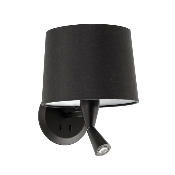 Musta Conga-seinävalaisin kangasvarjostimella ja LED-lukuvalaisimella Tämä seinävalaisin on ihanteellinen lisävaruste yksityisten huoneiden ja hotellien sisustukseen. Conga on suunniteltu kokonaan mustaksi, ja neutraalin värimaailman ansiosta se sopii erinomaisesti monenlaisiin sisustustyyleihin. Samalla kun päävalonlähde luo tunnelmallisen ilmapiirin, pieni LED-valaisin, jota voidaan kääntää 330 astetta ja kääntää 120 astetta, antaa mukavan lukuvalon - Lukuvalo: valon väri lämmin valkoinen (3 000 K), 280 lumenia