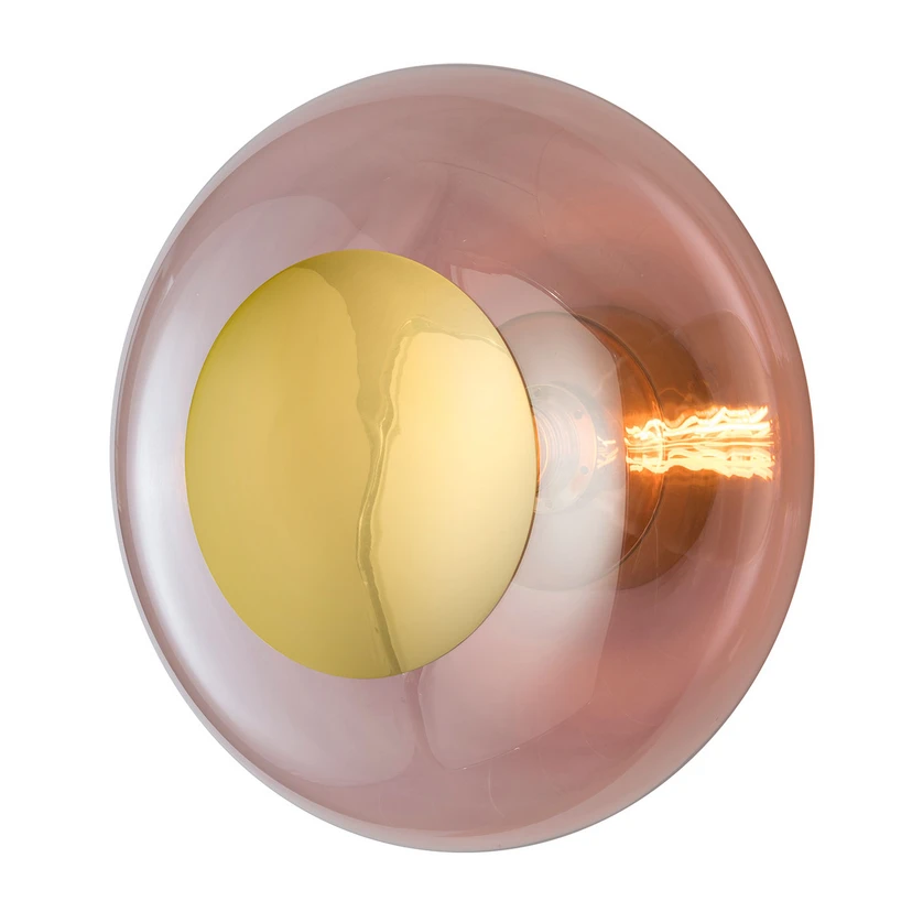 Ympäriinsä säteilevä Horizon-seinävalaisin lasivarjostimella - EBB & FLOW Pyöreästä, kullanvärisestä metallisesta seinäkannattimesta lähtevä kaunis, käsinpuhallettu kevyt lasi kaartaa huoneeseen korostaen visuaalisesti Horizon-seinävalaisinta. Tämän epätavallisen lisävalonlähteen koristeellisuutta voidaan korostaa entisestään valitsemalla lisävarusteena saatava koristeellinen valonlähde. Valo säteilee kaikkiin suuntiin ja luo huoneeseen viihtyisän tunnelman. Varjostin on valmistettu käsinpuhalletusta lasista. Jokainen valaisin on yksilö; valmistusprosessista johtuen saattaa esiintyä pieniä vaihteluita, kuten pieniä ilmansulkeumia jne. - Monipuolinen käyttö yksityishuoneissa ja hotellialalla