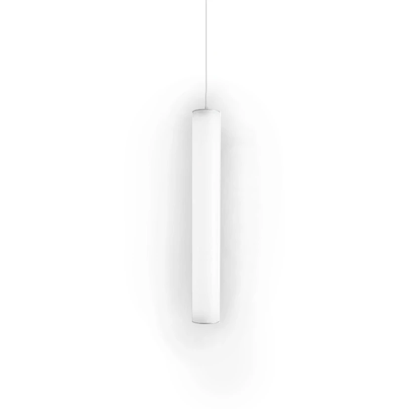 Sylinterimäinen LED-riippuvalaisin Lepo yksilölliseen ripustukseen, DALI-himmennettävä, yleisvalkoinen Yksinkertaisen, valaistustehoon keskittyvän muotoilunsa ansiosta LED-riippuvalaisin Lepo on ihanteellinen valinta modernien oleskelutilojen, käytävien ja liiketilojen yleiseen valaistukseen. Sen varjostin on korkea sylinteri, joka on valmistettu opaalimaisesta mattapintaisesta akryylistä. Integroidut valkoiset yleisvalaistut ledit on suunnattu eri suuntiin, jotta saadaan aikaan homogeeninen valaistustehoste joka puolelle varjoja aiheuttamatta. Valaisimen ylä- ja alapäät on valmistettu hopeaksi maalatusta teräslevystä. Kaapelissa on valkoinen tekstiilivaippa ja se päättyy valkoiseksi maalattua teräslevyä olevaan katokseen, joka on tarkoitettu yksittäisasennusta varten - integroidulla LED-muuntimella (DALI-himmennettävissä) - 5-nastainen liitäntäliitin - ei UV- tai lämpösäteilyä