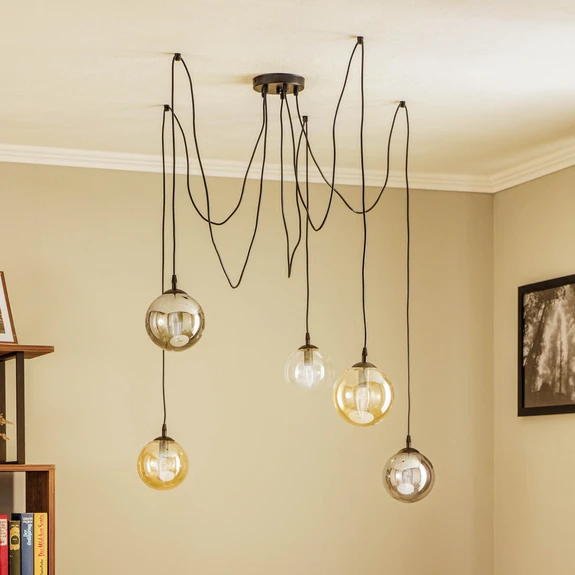 Glassy-riippuvalaisin yhdistää modernin muotoilun ja korkealaatuisen työn ja tarjoaa tyylikkään valaistusratkaisun erilaisiin oleskelutiloihin. Jauhemaalatusta teräksestä ja lasista valmistettu valaisin hurmaa elegantilla yhdistelmällään mustaa, grafiittia, meripihkaa ja kirkkaita sävyjä. Viisi valonlähdettä huolehtivat tasaisesta valaistuksesta ja luovat miellyttävän tunnelman olohuoneeseen, makuuhuoneeseen tai ruokailuhuoneeseen.