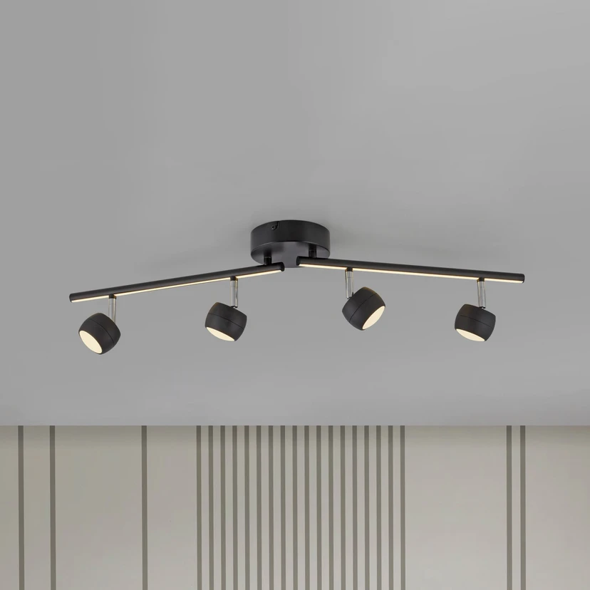 Jarik-LED-kattovalaisimessa yhdistyvät moderni muotoilu ja toiminnallinen, säädettävä valaistus. Rautasta ja muovista valmistettu musta valaisin sopii erityisen hyvin nykyaikaisiin sisustuskonsepteihin, joissa se voi valaista erilaisia tiloja. Neljän säädettävän spottin ja suorassa profiilissa olevien valonlähteiden valot voidaan kytkeä päälle yhdessä tai erikseen (spottit tai profiili) valokatkaisimella useita kertoja painamalla, jolloin valaistus voidaan valita tarpeen mukaan.