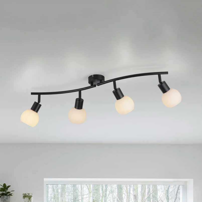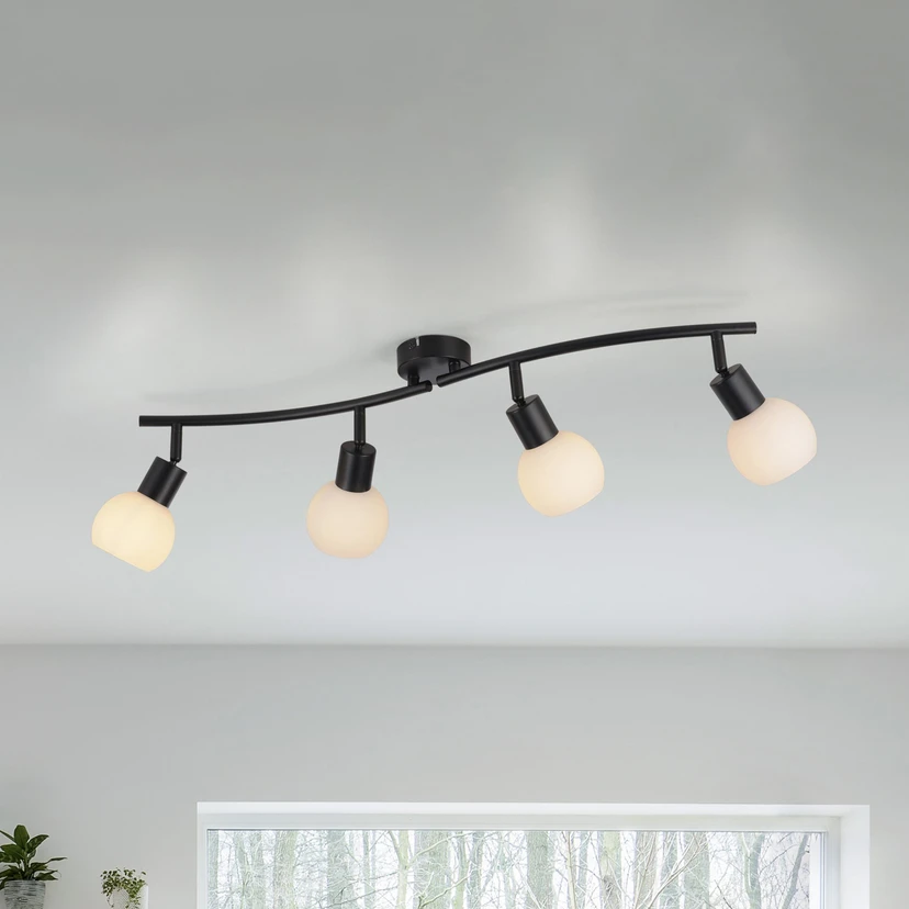 Loki-kattovalaisin raudasta ja lasista, nelilamppuinen, E14 LED-lamppuilla Pitkä, nelilamppuinen Loki-kattovalaisin koostuu mustaksi lakatusta rautakehyksestä ja neljästä lähes pallomaisesta lasivarjostimesta. Se on monikäyttöinen moniin kodin tiloihin, kuten olohuoneisiin, eteisiin ja makuuhuoneisiin. Valot voidaan säätää tarpeen mukaan. Mukana toimitetaan E14-kannalla ja lämpimän valkoisella valon värillä varustetut LED-lamput, jotka voidaan vaihtaa.