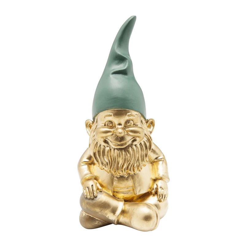 Istuva tonttu koristefiguuri, kullanvärinen, vihreä korkki Tämä istuva tonttu koristefiguuri, jossa on vihreä terävä korkki, on koristeellinen ja omaperäinen koriste-esine mihin tahansa huoneeseen. Omaperäisen hahmonsa ansiosta tämä tonttu todistaa, kuinka viehättäviä leikkisät mallit voivat olla. Iloisella hippihatulla varustettu tonttu on valmistettu polyresiinistä, ja siinä on korkeakiiltoinen kullanvärinen viimeistely. Hänet voi hyvin yhdistää muiden sarjan tonttuhahmojen kanssa.