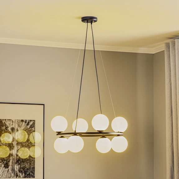 Kattokruunu Krone, 8-lamppuinen, yhdistää modernin muotoilun ja ajattoman eleganssin. Valmistettu korkealaatuisesta metallista ja lasista, se loistaa tyylikkäässä yhdistelmässä mustia ja valkoisia himmeitä elementtejä. Tämä kattokruunu ei ole vain katseenvangitsija, vaan myös osoitus eurooppalaisesta käsityötaidosta. Sen kahdeksan valonlähdettä takaavat tasaisen ja vaikuttavan valaistuksen olo- ja ruokailuhuoneisiin.