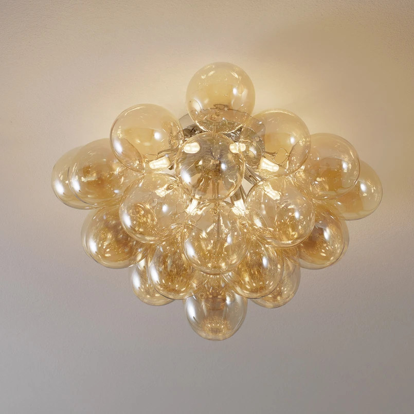 Balbo- kattovalaisin on kiehtova katseenvangitsija, joka on erityisen suuri taideteos leikkisän modernisuutensa ansiosta. Lamppu koostuu kattokiinnike, jossa on tyylikäs nikkelipinta ja jota ympäröivät lasikuulat. Pallot on järjestetty rypäleen muotoon, ja keltaisen sävynsä ansiosta ne luovat upeita valohetkiä. Koska lasi heijastaa valoa rungon sisäpuolelta, antaen lampulle maagisen hehkun, jonka se välittää ympäristöönsä.