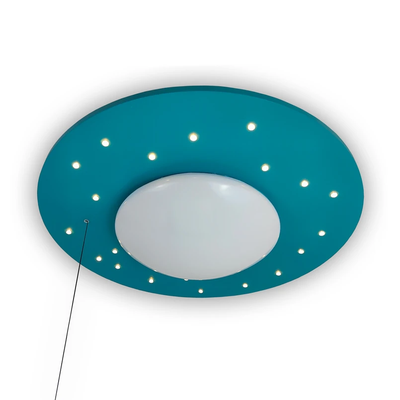 Tähtitaivaan kanssa: Starlight-kattovalaisin vetokytkimelläStarlight-kattovalaisin sopii sekä lastenhuoneen yleisvalaistukseksi että tähtitaivaana. kattolevyyn upotetut 20 yksittäistä lediä tuikkivat kuin pienet tähdet. Päävalonlähteenä on E27-pistorasia (polttimo ei sisälly, katso lisävarusteet). Se voidaan kytkeä pois päältä vetokytkimellä, jos haluat antaa vain tähtitaivaan loistaa. Se koostuu MDF-puusta ja muovista, ja se on lakattu yksiväriseksi.