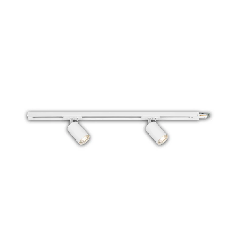 Kiskojärjestelmän laajennus mattavalkoisena täydentää aloituspakettia yhdellä kiskolla ja kahdella GU10-lamppujen spottivalaisimella.