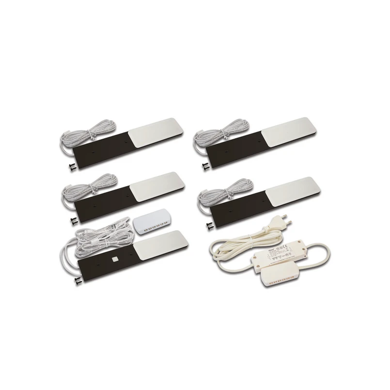 S-Pad F - käytännöllinen LED-kaapin alavalaisin kosketushimmentimellä, 5 kpl:n setti Tämä alumiinista valmistettu viiden litteän, suorakulmaisen S-Pad F LED-kaapin alavalaisimen setti tarjoaa laajakulmaisen työpistevalaistuksen keittiökomeroon. Mukana toimitetaan LED-ohjain pistotulojohdolla tulossa ja Hera LED 24 -pistoke (24 V) lähdössä virtaliitäntää varten (230 V). Kosketustoiminnolla (kytkentä ja himmennys) varustettu valaisin kytketään jälkimmäiseen; mukana toimitetaan jakotukki toisesta viidenteen valaisimeen kytkemistä varten - Kytkentävalmis setti, jossa on LED-ajuri, pistotulppakaapeli, jakotukki ja viisi S-Pad F LED -kaapin alla olevaa valaisinta - Muistitoiminto: viimeksi valittu kirkkaus on käytettävissä uudelleen päälle kytkemisen jälkeen