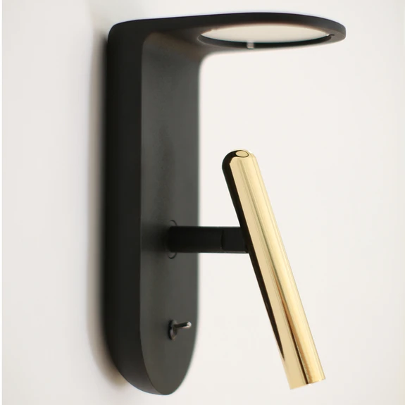 Erityisen tyypillinen piirre LED-seinävalaisin 2Nights_W2:ssa on lieriömäinen, kapea kohdevalaisin, joka on maalattu säteilevällä kultavärillä. Joustavan nivelensä ansiosta se voidaan vaivatta kääntää haluttuun suuntaan ja kiertää myös itsensä ympäri. Tämä tekee tästä valonlähteestä ihanteellisen lukuvalaisimen, koska näin on mahdollista myös lämpimän valkoisen valaistuksen helppo ohjaus. Erityisen kaunis valovaikutus saavutetaan kuitenkin, kun kohdevalaisin on suunnattu ylöspäin. Silloin säteily nimittäin kulkee pyöreän diffuusorin kautta siniselle värisuodattimelle, joka projisoi seinälle kevyen ja lempeän aaltokuvion. Sveitsiläinen muotoilija Davide Oppizzi on 2Nights_W2:ssa luonut valonlähteen, joka yhdistää käytännön joustavuutta ja modernia optiikkaa. Katkaisija rungossa.