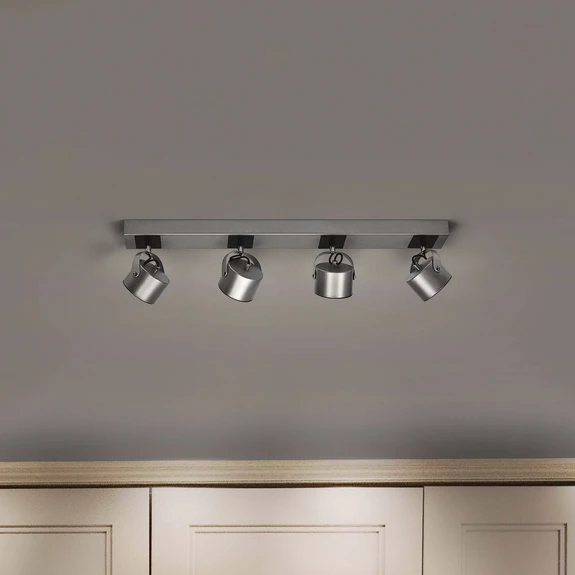 Jupiter LED-kattokohdevalaisin pitkässä muodossa, jossa on 4 säädettävää spottia Jupiter on laadukas, neliliekkinen LED-kohdevalaisin, joka koostuu pitkästä katosta ja neljästä pyöreästä valopäästä, joissa on lämpimänvalkoiset LEDit kiinnitettynä siihen. Se on valmistettu teräksestä, jossa on hopeinen viimeistely ja musta reunus, ja neljä valaisinpäätä voidaan paitsi kääntää kiinnikkeissään myös kääntää, jotta huoneen eri alueet voidaan valaista kohdennetusti. Nelilamppuinen LED-kohdevalaisin sopii käytettäväksi monenlaisissa sisätiloissa, olipa kyseessä sitten eteinen, keittiö, työtila, olohuone tai makuuhuone. Asennus- ja liitäntätarvikkeet sisältyvät toimitukseen.