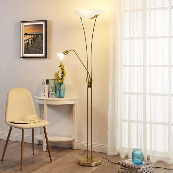 Felicia - kattopesuvalaisin, jossa on hyödyllinen lukuvarsi Tässä kattopesuvalaisimessa on hyvin klassinen ulkonäkö, joka ei johdu ainoastaan sen muodosta vaan myös metallikehyksen messinkinvärisestä pinnasta. Siksi valaisin sopii täydellisesti klassisiin asuinympäristöihin, joissa se on erittäin hyödyllinen valaistuselementti, sillä kattopesuvalaisimen ja lukuvarren yhdistelmä osoittautuu erittäin käytännölliseksi. Felicia-kattopesuvalaisin tarjoaa ensisijaisesti viihtyisää valoa epäsuoralla vaikutuksella, kun taas lukuvarsi antaa lukemiseen tarvittavaa kohdennettua valoa, jotta silmäsi ovat suojassa ja voit nauttia lukemisesta pitkään.