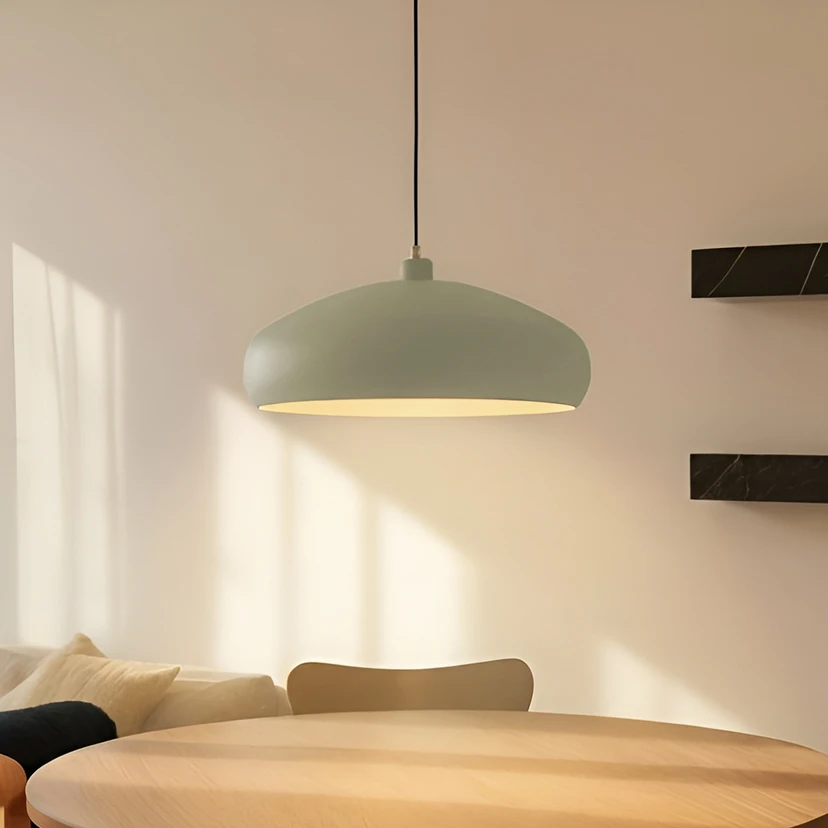 Elover-riippuvalaisin pehmeän vihreällä värillä Elover-riippuvalaisin on valmistettu raudasta. Pyöreä varjostin on kauttaaltaan läpinäkymätön ja avautuu vain alaspäin. Näin syntyvä valo valuu suoraan alaspäin ja valaisee esimerkiksi pöytäpintoja laajasti. Varjostimen sisäpuoli heijastaa valoa lempeästi ympäristöön ja korostaa Eloverin kaunista vaaleanvihreää väriä.