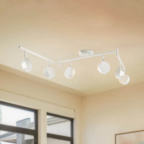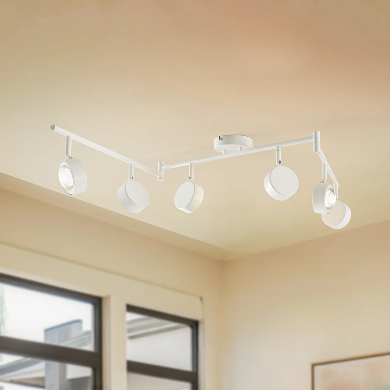 Himmennettävä Jyla-kohdevalaisin kuudella säädettävällä sävyllä Kuusivaloinen Jyla-kattokohdevalaisin on valmistettu raudasta, ja sen valkoinen ulkopinta antaa ympäristöön tyylikkään ilmeen. Samalla se sulautuu vaivattomasti erilaisiin asuintiloihin huomaamattoman muotoilunsa ansiosta. Se sopii esimerkiksi eteisen, keittiön, olohuoneen tai ruokasalin valonlähteeksi. Runkoa voi säätää kolmesta kohdasta, ja pyöreitä varjostimia voi myös kallistaa ja kääntää joustavasti. Näin valoa voidaan räätälöidä ja tilaa valaista optimaalisesti. Mukana toimitetuissa GX53-valonlähteissä on kaareva linssi, joten ne näyttävät lasipuolikkailta. Valo voidaan kytkeä päälle ja pois päältä tavalliseen tapaan seinäkytkimellä. Integroidulla sammutustoiminnolla varustetun kolmiportaisen himmennystekniikan ansiosta se voidaan myös himmentää kolmeen eri kirkkaustasoon painamalla kytkintä useita kertoja: 100 %, 50 % ja 25 %.