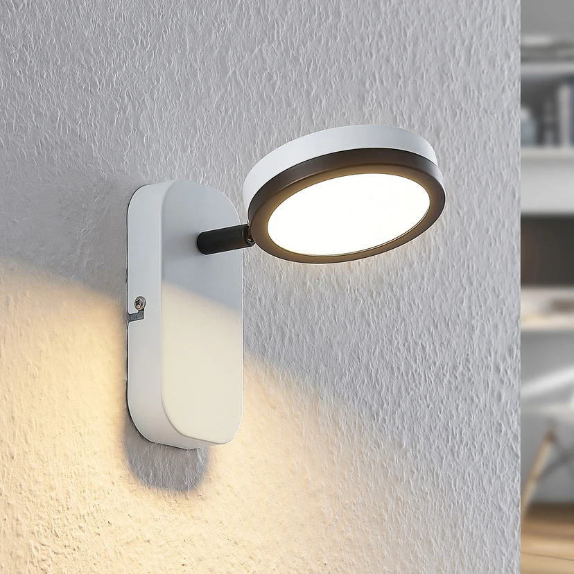 Vesim-kohdevalaisin joustavalla valonlähteellä Vesim on ajaton valonlähde, joka voidaan kiinnittää sekä kattoon että seinään. Ohut kotelo on valmistettu raudasta ja siinä on valkoinen viimeistely. Pyöreässä valaisinpäässä on lisäksi musta värillinen rengas, joka viimeistelee ilmeen. Tässä valonheittimessä on GX53-pistorasia, ja sitä voidaan kääntää ja kallistaa tarpeen mukaan, jotta valon säteilyä voidaan mukauttaa omiin tarpeisiisi.