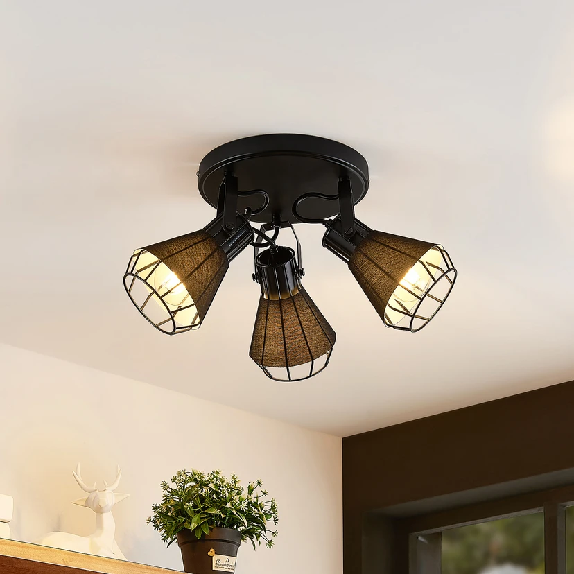 Yusei-pyöreä kattokohdevalo on täydellinen asennettavaksi olohuoneeseen tai ruokasaliin. Kolme lampunvarjostinta on kiinnitetty ympyrässä pyöreään kattokiinnike ja osoittavat eri suuntiin. Lampun runko on rautaa ja sävyjä ympäröi myös kangas. Molemmat materiaalit ovat mustia, mikä antaa valokeilaan vankan luonteen. Se asettaa huomiota herättäviä aksentteja sisustukseen ja kiertää sisustustyylin hyväntahtoisesti. Sopivan valaistuksen saavuttamiseksi se voidaan varustaa E27-lampuilla, myös hehkulampuilla, jotka korostavat lampun muotoilua erityisellä ulkonäöllä.