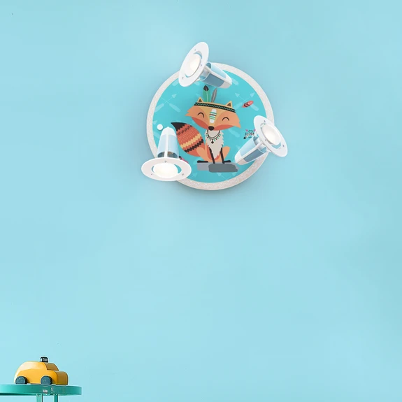 Pieni intiaanien kattovalaisin on pyöreä puinen lamppu, jossa on kolme liikkuvaa valonlähdettä. Lapsiystävällisessä kuvassa näkyy intialainen tyyli kettu Filip, jota koristaa höyhenpäähine.
