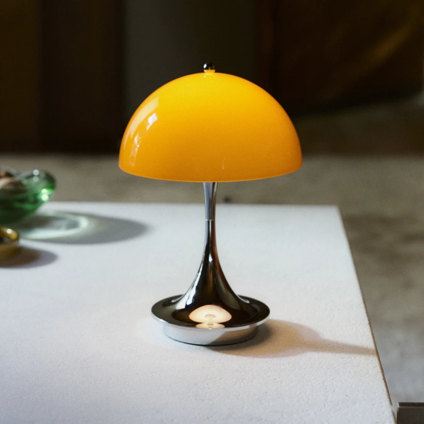 Louis Poulsenin Panthella 160 Portable Original yhdistää Verner Pantonin ikonisen muotoilun ja modernin toiminnallisuuden. Valaisin on valmistettu muovista, kuten PMMA:sta, ABS:stä ja polykarbonaatista, ja se vakuuttaa vankalla rakenteellaan ja IP44-luokituksellaan, joka tekee siitä ihanteellisen terassille tai parvekkeelle. Opalioranssi lampunvarjostin antaa valon loistaa pehmeästi. Lisäksi valaisimessa on kromivärinen jalka, joka antaa sille ajattoman eleganssin, joka sopii saumattomasti olohuoneeseen, ruokailuhuoneeseen tai makuuhuoneeseen.