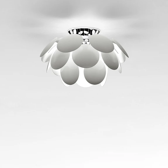 Discocó-muotoilun kattovalaisimen avulla olohuoneisiin ja makuuhuoneisiin sekä käytäville ja eteisiin siirtyy paitsi koristeellinen sisustustarvike myös upea valonleikki. Kromatusta metallisesta puolipallosta ABS-muovista valmistetut levynmuotoiset elementit ulottuvat huoneeseen. Käytettyjen lamppujen valo luo toisaalta valon ja varjon vaihtelevan leikin, ja toisaalta se luo kromattuun metallipuolikehään osuessaan upeita heijastuksia.