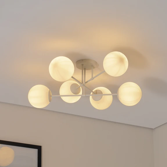 Hiekanvärinen Moon-kattovalaisin monipuoliseen huonesuunnitteluun Moon-kattovalaisin, jossa on kuusi liekkiä, asettaa uudet standardit huonevalaistukselle. Sen hiekanvärinen pinta sekä metallin ja lasin yhdistelmä luovat tunnelman, joka voi olla sekä rauhoittava että stimuloiva. Moon on suunniteltu luomaan erityistä tunnelmaa erilaisiin tiloihin, kuten olohuoneeseen, ruokasaliin, makuuhuoneeseen tai keittiöön, ja se mukautuu saumattomasti yksilöllisiin tarpeisiin. Euroopassa valmistettu Moon edustaa laatua ja paikallista käsityötaitoa. Vaikka tämän mallin mukana ei toimiteta himmennintä, kirkkautta voidaan säätää ulkoisella himmentimellä, jolloin valaistustunnelmaa voidaan vaihdella tilanteen mukaan.
