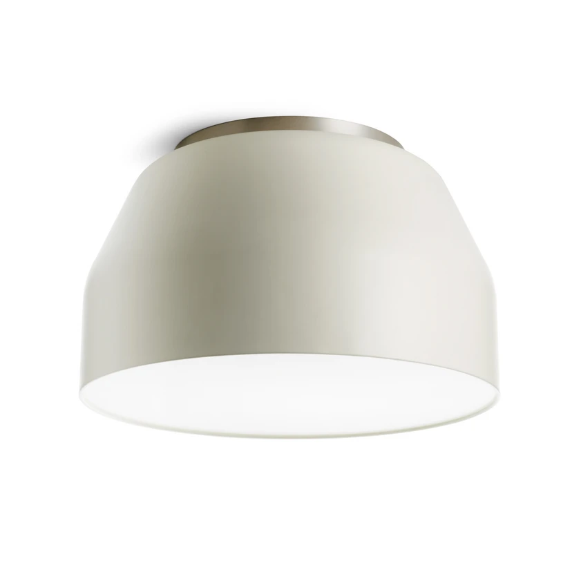 Kermanvalkoinen kattovalaisin Mug pyöreässä muodossa Italialaisen muotoilijan ja arkkitehdin Davide Negrin suunnittelemalle Mug-valaisinsarjalle on ominaista hillitty, monipuolisesti yhdisteltävä muotoilu. Metallista valmistetussa pyöreässä, kermanvalkoisessa varjostimessa on alemmassa aukossa opaalinen, pleksilasista valmistettu suojus, joka takaa tasaisen valon leviämisen. Tähän on lisätty kattovalaisin harjatun kromin näköisenä.