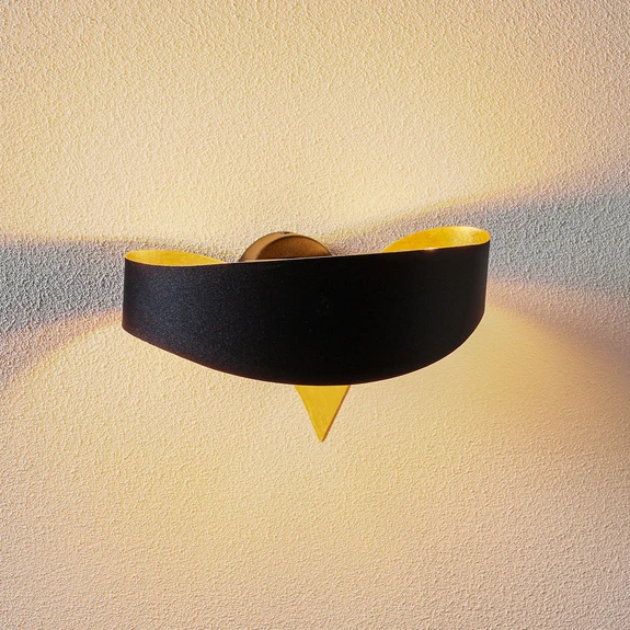 Scudo-seinävalaisin design-laatuaLaadukkaassa Scudo-seinävalaisimessa yhdistyvät korkealaatuiset materiaalit ja valmistustekniikka. Tyylikkäästi muotoiltu teräsnauha leikataan ensin laserilla, minkä jälkeen se taivutetaan ja viimeistellään käsin. Valaisinobjekti ei toimi pelkästään huoneen valaistukseen tarkoitettuna käyttöesineenä. Pikemminkin se on taiteellinen design-veistos, joka tuo sisustukseen ylellisen ja tyylikkään korostuksen. Mustan pinnan ja lehtikultaisen sisustuksen yhdistelmä sulautuu myös ajattomasti monenlaisiin sisustustyyleihin.