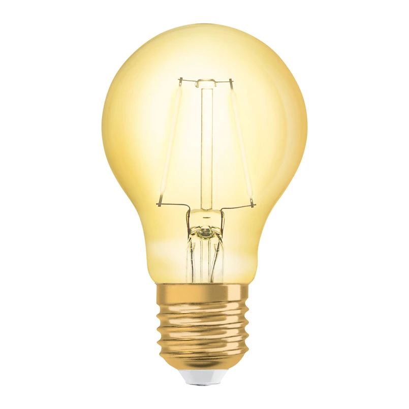 Tämä LED-lamppu tarjoaa OSRAM : n Vintage Edition LED-lamppu OSRAM koristeellisen valon, joka on lämmin valkoinen ja 2400 K. Hehkulamppu, jossa on kullanvärinen lasipolttimo, sopii hyvin kaikkiin valoihin, joissa on läpinäkyvä varjostin tai ei.