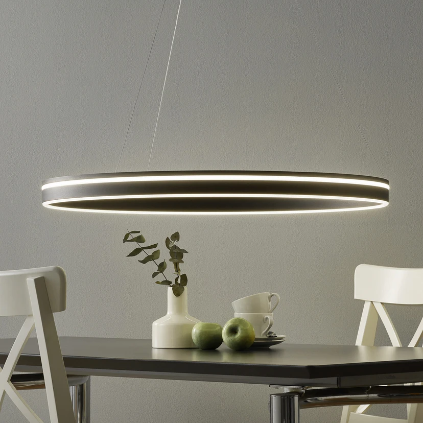 Älykkäästi ohjattava LED-riippuvalaisin Q-Vito rengasmuodossa Q-Vito on läpikotaisin moderni LED-riippuvalaisin. Se on muotoiltu vaakatasossa roikkuvaksi metalliseksi renkaaksi, jonka ulko- ja alapuolella on kaksi ympärysmittaista valonauhaa. Myös kirkkauden ja valkoisen valon lämpötilan (2700-5000 K) kaukosäätömahdollisuudet ovat huippuluokkaa. Tämä voidaan tehdä ilman lisälaitteita mukana toimitetulla kaukosäätimellä, jolle voidaan määrittää jopa 20 Q-valoa, sekä ääniohjauksella ZigBee-keskittimellä varustetun Amazon Echo Plussan tai Echo Show'n (2. sukupolven) kautta. ZigBee-silta ja WLAN tarvitaan sovelluksen kautta tapahtuvaan käyttöön tai integrointiin yhteensopiviin älykotijärjestelmiin. Tekniset tiedot/yhteensopivuus: - Himmennettävissä - Valon lämpötila säädettävissä lämpimästä valkoisesta yleisvalkoiseen - Muistitoiminto - Jopa 20 yksittäisen Q-valon tai Q-lamppujen kytkeminen max. 3 ryhmään vain yhdellä Q-kaukosäätimellä. 3 ryhmää yhdellä Q-kaukosäätimellä - ZigBee-yhteensopiva - Voidaan ohjata kaukosäätimellä - Ääniohjaus Echo Plussan ja Echo Show'n (2nd gen) kautta suoraan mahdollista - Voidaan ohjata kätevästi myös sovelluksen kautta, kun se on integroitu ZigBee-pohjaiseen älykotijärjestelmään Huomautus: Älykotijärjestelmään liittämiseen tai sovelluksen ohjaukseen tarvitaan silta, joka ei sisälly toimitukseen