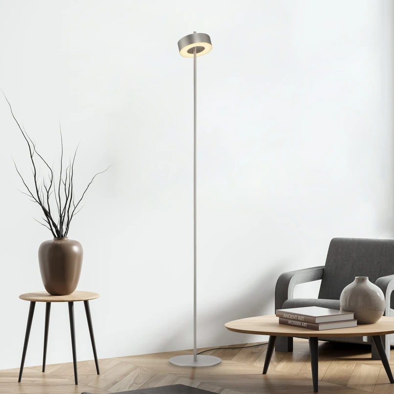 Moderni Q-Rotate LED-lattiavalaisin kallistuvalla lampunvarjostimella - älykäs ja kaukosäätimellä ohjattava Q-Rotate LED-lattiavalaisin on sekä toiminnallisesti että visuaalisesti ajan tasalla. LED-moduuli sijaitsee renkaanmuotoisen alumiinisen lampunvarjostimen sisällä, joka on kääntyvästi asennettu lähelle hoikan, pystysuoran runkotangon yläosaa. Valo säteilee renkaan ylä- ja alapuolella olevien satinoitujen suojusten läpi, ja mukana on sopiva Q-kaukosäädin, jolla valoa voidaan kytkeä, himmentää ja säätää värilämpötilaa. Valon vapaan säädön lisäksi tämä tarjoaa myös valmiiksi määritettyjä vaihtoehtoja, joten täydellinen valaistus on kätevästi saatavilla lähes kaikkiin tilanteisiin. Vaihtoehtoisesti Q-Rotate-lattiavalaisin voidaan integroida langattomasti ZigBee-pohjaisiin älykotijärjestelmiin (silta vaaditaan), jotta sitä voidaan ohjata sovelluksen tai äänikomennon avulla kokoonpanosta riippuen.
