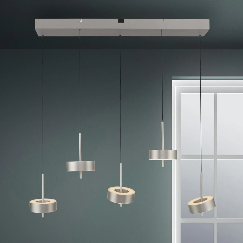 Viisi valoa Q-Rotate LED-riippuvalaisin säädettävillä lampunvarjostimilla - älykäs ja kaukosäätimellä ohjattava Q-Rotate LED-riippuvalaisin on sekä toiminnallisesti että visuaalisesti ajan tasalla. Viisi rengasmuotoista alumiinista lampunvarjostinta on kiinnitetty kääntyvällä tavalla keskitankoon, ja jokaisessa niistä on LED-moduuli. Valo säteilee renkaiden ylä- ja alapuolella olevien satinoitujen suojusten läpi. Comfort Liftin ansiosta riipuksen korkeutta voidaan säätää manuaalisesti milloin tahansa, ja toimitukseen sisältyy sopiva Q-kaukosäädin kytkemistä, himmentämistä ja värilämpötilan säätämistä varten. Valon vapaan säädön lisäksi tämä tarjoaa myös valmiiksi konfiguroituja vaihtoehtoja, joten täydellinen valaistus on kätevästi saatavilla lähes kaikkiin tilanteisiin. Vaihtoehtoisesti Q-Rotate-riippuvalaisin voidaan integroida langattomasti ZigBee-pohjaisiin älykotijärjestelmiin (silta vaaditaan), jotta sitä voidaan ohjata sovelluksen tai äänikomennon avulla kokoonpanosta riippuen.