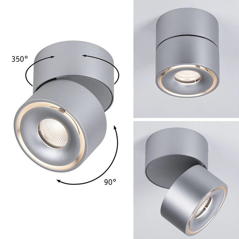 Pyörivä ja kääntyvä Spircle-pinta-asennettava LED-valonheitin luo valaisevia korostuksia olohuoneisiin ja makuuhuoneisiin. Sitä voidaan kääntää 85 astetta ja kääntää 350 astetta, jotta voidaan valaista juuri ne alueet, joihin tarkennus halutaan asettaa. Moderni ulkoasu ja teollinen kosketus tekevät Spircle-valaisimesta valonlähteen, joka voidaan yhdistää moniin olohuoneen muunnelmiin. Sädekulma on 36 astetta. Valo loistaa miellyttävän lämpimän valkoisen valon värisenä ja luo huoneeseen tunnelmallisen ilmapiirin.