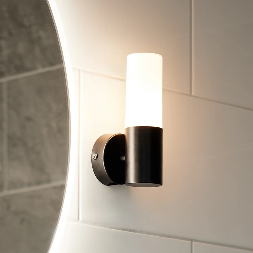 Beta-seinävalaisin kylpyhuoneeseen IP44-suojalla Mattamustasta metallista ja opaalilasista valmistettu lieriömäinen Beta-seinävalaisin sopii kylpyhuoneeseen roiskesuojan (IP44) ansiosta ja tarjoaa miellyttävän ympärivuotisen valaistuksen.