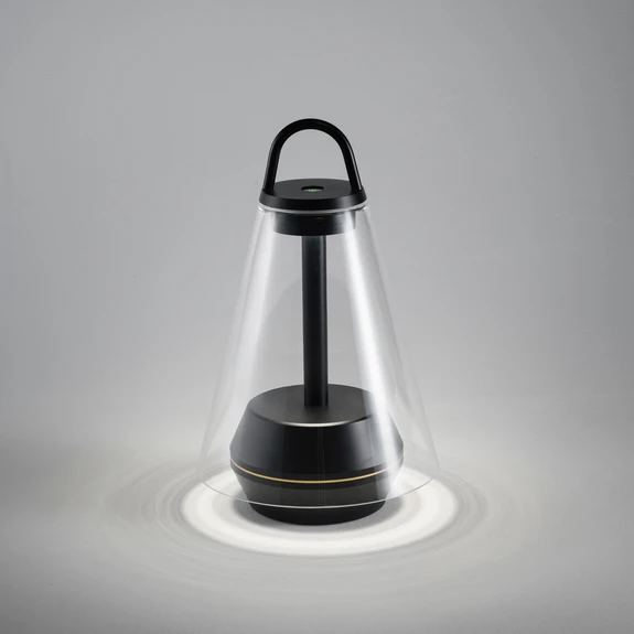 Kannettava LED-pöytävalaisin Shuttle - design-valaistus sisätiloihin ja ulkotiloihinShuttle LED-pöytävalaisimen epätavallinen muotoilu on saanut inspiraationsa NASA:n historiallisesta avaruussukkula-järjestelmästä. Kartiomainen diffuusori, joka toimii myös integroitujen LEDien suojana, on valmistettu suupuhalletusta lasista. Ledit ovat kannettavaksi akkuvalaisimeksi epätavallisen tehokkaita, ja niiden kirkkautta sekä valon väriä voidaan kätevästi säätää. Tämä tapahtuu kätevästi kosketushimmentimellä, jota käytetään valon kytkemiseen päälle ja pois päältä yksinkertaisella napautuksella. Pidempi painallus himmentää valoa ja lyhyt kaksoispainallus vaihtaa valon värin kahdessa vaiheessa lämpimästä valkoisesta yleisvalkoiseen. Itse LED-pöytävalaisinta voidaan käyttää missä tahansa kodin ympärillä ja sisällä. Shuttlea voi kuljettaa kätevästi olohuoneessa tai terassilla integroidun kantokahvan ansiosta. Valaisin voidaan ladata USB-liitännän avulla. Latausaika on noin kahdeksan tuntia, jotta se voi loistaa neljä tuntia.