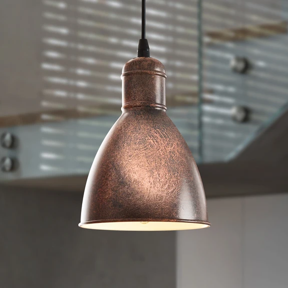 Priddy 1 -riippuvalaisimen metalliosat ovat antiikkisen kuparin värisiä. Vintagetyylinen riippuvalaisin sopii yksityisten asuntojen monien eri huoneiden pöytien tai tasojen valaisemiseen, mutta se soveltuu myös ravintoloihin ja täydentää jokaista sisustusta vanhaa tyyliä kunnioittavalla ulkoasullaan. Valonlähteeksi voidaan asentaa perinteisten hehkulamppujen ohella energiaa säästävät led-lamput tai energiansäästölamput.