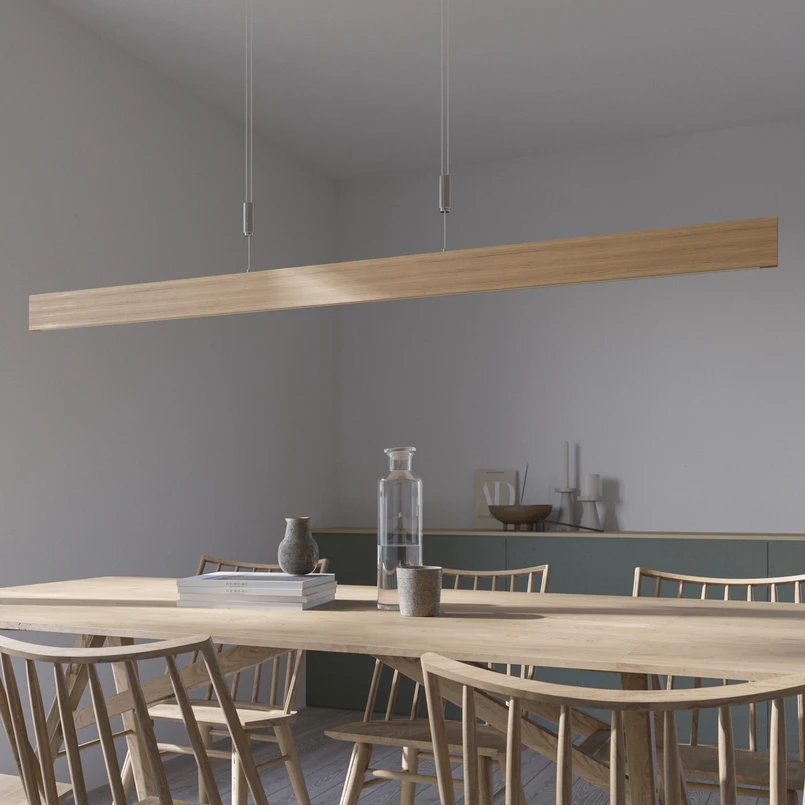 Kapea, korkeussäädettävä Lise LED-riippuvalaisin, joka on valmistettu vaaleasta, massiivisesta tammipuusta - korkealaatuinen tuote, valmistettu Saksassa Lise LED-riippuvalaisin sopii erinomaisesti ruokapöydän yläpuolelle, sillä se mahdollistaa pöydän pinnan valaisemisen laajalta alueelta. Massiivitammesta valmistettu runko näyttää erittäin hoikalta, ei vähiten korkean muotonsa vuoksi, ja sille on ominaista ehdoton suoraviivaisuus, joka on tervetullut piirre moderneissa, puristisissa asuintiloissa. Ripustuksen korkeutta voidaan säätää tarpeen mukaan 105 cm:stä 195 cm:iin vaijerinvetorakenteen avulla. Ihanan luonnollisen näköisen tammipuun pinta on viimeistelty huolella käsin äärimmäisen tarkasti, ja tuloksena on erittäin edustava ulkonäkö, joka tekee vaikutuksen kautta linjan. Jotta asennuksessa olisi mahdollisimman paljon mukavuutta, Lise LED-riippuvalaisimessa on erittäin suuri liitäntälokero, jossa on riittävästi tilaa liitäntäpäätteille ja kaapeloinnille. Valaisimen lämpimänvalkoisille LED-valoille on ominaista erittäin hyvä värintoisto, jonka CRI-arvo on yli 90, ja ne ovat myös ehdottoman tehokkaita, joten riippuvalaisimen toiminta vaatii vain vähän virtaa, mutta tarjoaa maksimaalisen valotehon, jotta pöytä on kirkkaasti ja riittävästi valaistu. Ulkoisen himmentimen (etu- tai takareunan vaiheohjaus) avulla valon voimakkuutta voidaan säätää tarkasti, jos valon halutaan olevan vähemmän kirkas ja erityisen viihtyisä. Lise-riippuvalaisin on Saksassa valmistettu korkealaatuinen valaistustuote, joka luonnollisen säteilynsä ja laadukkaan tammipuunsa ansiosta on hieno lisä hienostuneeseen miljööseen.