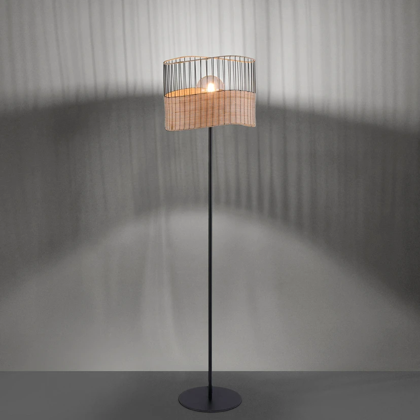 Tämän lattiavalaisimen kohokohta on kauniisti muotoiltu varjostin. Se koostuu sirosta metallikorista, jossa on tyylikkäät ja kaarevat linjat. Yleisilme muistuttaa sylinterin muotoa. Metallin melko viileä ja hillitty muotoilu täydentyy harmonisesti puukudoksella. Noin puolet Reed-lattiavalaisimen varjostimesta on päällystetty hienolla rottinkipunoksella, joka kulkee pohjasta. Siinä on hienovarainen kuvio ja se tarjoaa jännittäviä valotehosteita. Valonlähde näkyy yläosassa ja säteilee huoneeseen himmentämättä, minkä vuoksi suositellaan käytettäväksi koristeellista hehkulamppuvalaisinta. Valaisinta käytetään kätevästi sisäänrakennetulla jalkakytkimellä.
