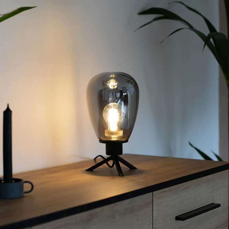 Lumoava Reflexion-pöytävalaisin savulasivarjostimella Reflexion-pöytävalaisin ei ole vain muotoilun kohokohta, vaan myös erittäin toimiva. Savulasivarjostin antaa miellyttävän valaistustehon ja luo kodikkaan tunnelman. Kolmijalkainen, musta metallirunko ei ole ainoastaan vakaa, vaan antaa valaisimelle myös modernin ilmeen. Valaisin sopii erinomaisesti olohuoneiden ja makuuhuoneiden lisävalaisimeksi. Johdossa oleva kytkin takaa helpon käytön ja tekee Reflexion-pöytävalaisimesta mutkattoman arjen seuralaisen.