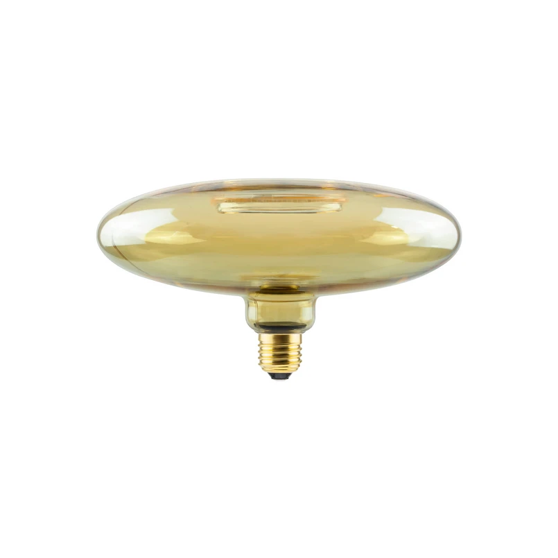 LED-valaisin Floating Ufo E27 4 W, himmennettävä, kultainen Tämä litteä, ovaalin muotoinen, lasista valmistettu LED-valaisin, jossa on E27-kanta, on Segulan Floating-sarjan valonlähde, joka sopii täydellisesti mihin tahansa avoimeen valaisimeen. Se säteilee kiehtovaa valoa ja antaa vaikutelman leijumisesta Segulan nerokkaan ja patentoidun pehmeän hehkulankatekniikan ansiosta. LED-valaisinta voidaan himmentää useimmilla tavallisilla himmentimillä, esim. Jung, GIRA, ELTAKO ja monet muut. Epätavallisen muotoinen valonlähde on katseenvangitsija missä tahansa lampunpitimessä sekä yksityisissä että kaupallisissa tiloissa, olipa kyseessä sitten olohuone, hotellin aula tai ravintola. Segulan Floating-sarja on palkittu Plus X Award -palkinnolla kategorioissa Innovaatio, Korkea laatu ja Design.