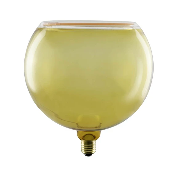 E27 LED-lasilamppu Floating, Ø 200 cm, 6 W, keltainen lasilamppu Tässä Floating-sarjan E27-LED-lamppuvalaisimessa on keltainen lasilamppu, joka on suuressa G200-pallon muotoisessa pallossa, joka on avoin kantaan nähden vastakkaisesta päästä. Diodit on integroitu renkaan muotoiseen aukkoon. E27-metallisessa kannassa on kultainen viimeistely, ja patentoitu pehmeä hehkulankatekniikka ja houkuttelevat valonheijastukset antavat valonlähteelle lisää koristeellisuutta. Ihanteellinen avoimiin valaisimiin, joissa ei ole varjostinta, tai lampunpitovalaisimiin - ulkoisesti himmennettävissä (takareuna) - erittäin lämmin valkoinen valo - hyvä värintoisto (CRI 90) - käsintehty lasipolttimo