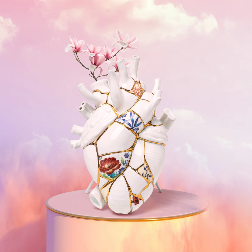 Love in Bloom Kintsugi -maljakko posliinista, jossa on kultaisia yksityiskohtia Italialainen valmistaja SELETTI tuo Love in Bloom Kintsugi -maljakossa kukat kuvallisesti suonien kautta sydämeen, ikään kuin sydän olisi sipuli, josta tunteiden nuput puhkeavat kukkaan. Sydän, joka symboloi elämää niin kuin tuskin mikään muu, kertoo meille nyt tarinansa vahvalla identiteetillä ja estetiikalla kultaisilla viivoilla yhdistettyjen palastensa avulla. Sisältää jalustan ja lahjapakkauksen.