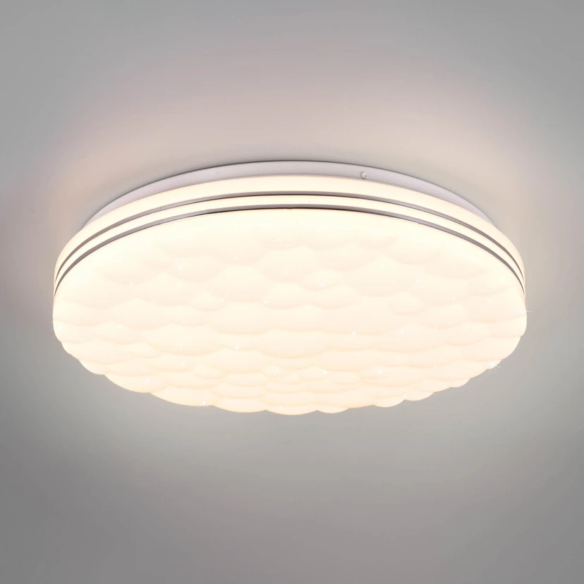 LED-kattovalaisin Tiger on muodoltaan yksinkertainen, pyöreä, valkoisesta muovista valmistettu valaisin, joka herättää huomiota erinomaisella toiminnallisuudellaan. Laitteen mukana toimitetaan kaukosäädin, jolla voidaan säätää kaikkia asetuksia. Kirkkautta ja värilämpötilaa (lämpimästä valkoisesta päivänvaloon) voidaan säätää tilanteen mukaan, ja värillinen valo (mukaan lukien sateenkaaritehoste) voidaan myös aktivoida koristevalaistusta varten. Lukuisat pienet aukot luovat tähtitaivaan vaikutelman. Pimeässä yövalotoiminto voidaan aktivoida huomaamattomalla valoteholla.