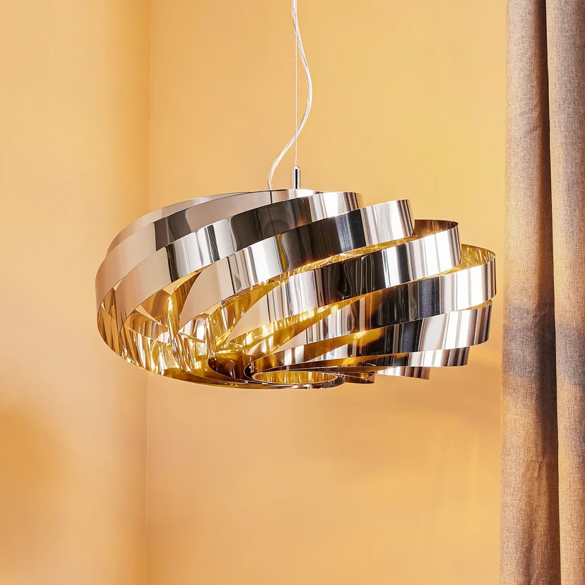 Kromin ja nikkelin värinen Vento-riippuvalaisin moderniin asuintilaan Vento-riippuvalaisinta ei korista ainoastaan silmiinpistävä, spiraalin muotoisista metalliliuskoista valmistettu varjostin, vaan se erottuu myös erityisen houkuttelevan valonlähteensä ansiosta. Varjostimen aukkojen kautta valo säteilee myös sivuille ja luo seinille koristeellisia valo- ja varjokuvioita. Modernin olohuoneen valonlähde, joka sopii erinomaisesti esimerkiksi pöytävalaisimeksi.