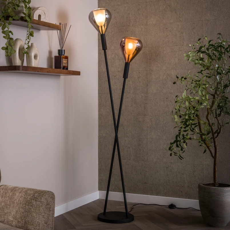 2-lamppuinen Wings-lattiavalaisin, pisaranmuotoisilla lasivarjostimilla, G9-kanta